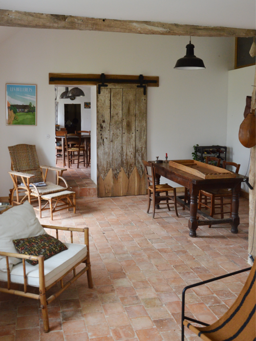 Le projet de rénovation de cette maison de campagne s’est déroulé en plusieurs phases, visant à moderniser et à agrandir l’habitat tout en préservant son caractère authentique. Dans un premier temps, la maison existante a été réorganisée pour optimiser les espaces. L’agrandissement de la cuisine a été rendu possible grâce à la suppression d’une chambre. Le cagibi et la salle de bain ont été repensés pour offrir une meilleure circulation et une plus grande fluidité entre les différentes zones de vie. Dans un second temps, deux extensions sont venues compléter la structure d’origine. La première concerne l’aménagement du garage en chambre d’amis, aménagée en mezzanine : un lit à l’étage, un canapé-lit en partie basse, le tout agrémenté d’un poêle à bois pour une ambiance chaleureuse. L’apport des réseaux électrique et d’eau a permis de créer un espace de vie indépendant, incluant des toilettes. Pour l’intégration à la façade existante, le dessin des ouvertures (portes et fenêtres) a été harmonisé avec celles de la maison, tandis qu’un sol en tomette rappelle le cachet de l’ancienne bâtisse. La seconde extension investit une partie de la grange, transformée en espace salle à manger / salon. Une isolation complète par l’intérieur assure le confort thermique, et des ouvertures en hauteur permettent de révéler la magnifique charpente en bois, ajoutant caractère et authenticité. L’ensemble de ces interventions offre une maison de campagne repensée, fonctionnelle et lumineuse, fidèle à l’âme du lieu et prête à accueillir famille et amis en toute convivialité.