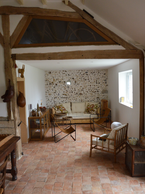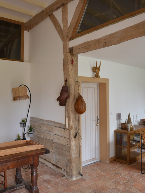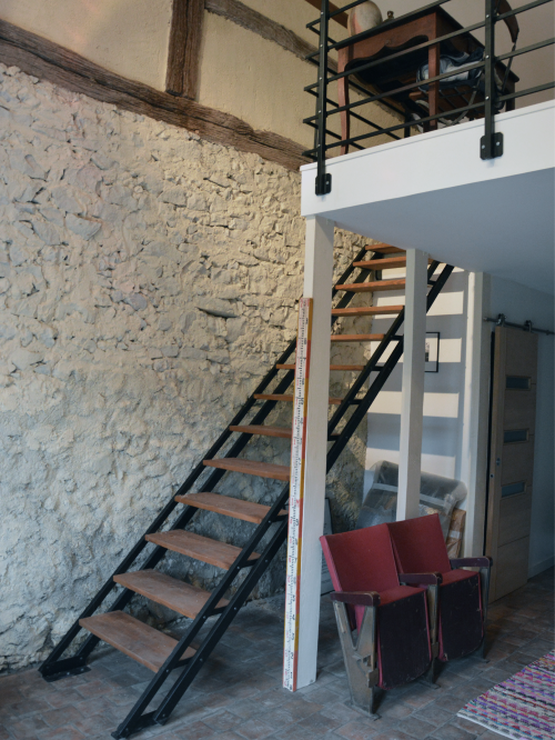Le projet de rénovation de cette maison de campagne s’est déroulé en plusieurs phases, visant à moderniser et à agrandir l’habitat tout en préservant son caractère authentique. Dans un premier temps, la maison existante a été réorganisée pour optimiser les espaces. L’agrandissement de la cuisine a été rendu possible grâce à la suppression d’une chambre. Le cagibi et la salle de bain ont été repensés pour offrir une meilleure circulation et une plus grande fluidité entre les différentes zones de vie. Dans un second temps, deux extensions sont venues compléter la structure d’origine. La première concerne l’aménagement du garage en chambre d’amis, aménagée en mezzanine : un lit à l’étage, un canapé-lit en partie basse, le tout agrémenté d’un poêle à bois pour une ambiance chaleureuse. L’apport des réseaux électrique et d’eau a permis de créer un espace de vie indépendant, incluant des toilettes. Pour l’intégration à la façade existante, le dessin des ouvertures (portes et fenêtres) a été harmonisé avec celles de la maison, tandis qu’un sol en tomette rappelle le cachet de l’ancienne bâtisse. La seconde extension investit une partie de la grange, transformée en espace salle à manger / salon. Une isolation complète par l’intérieur assure le confort thermique, et des ouvertures en hauteur permettent de révéler la magnifique charpente en bois, ajoutant caractère et authenticité. L’ensemble de ces interventions offre une maison de campagne repensée, fonctionnelle et lumineuse, fidèle à l’âme du lieu et prête à accueillir famille et amis en toute convivialité.